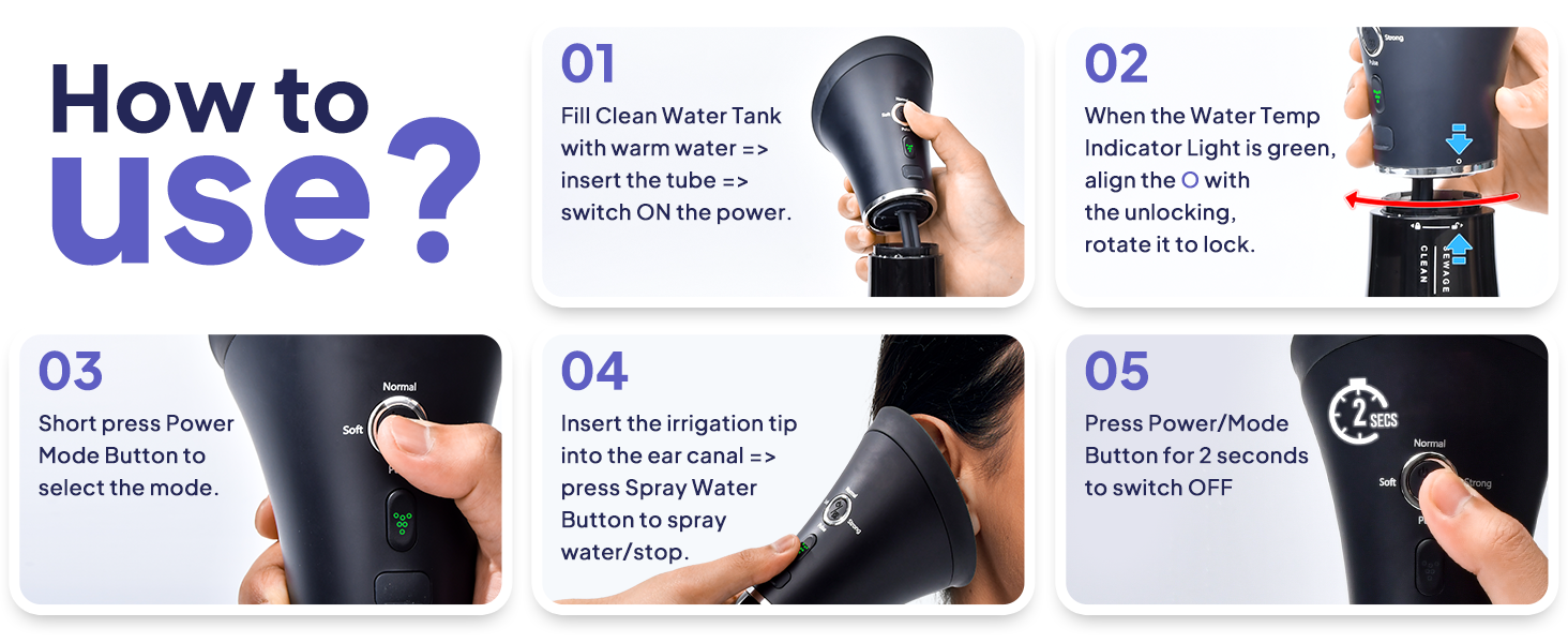 Instead of pressure or manual tools, it uses gentle hydro-flushing technology. Just place the soft tip near your ear opening, press the button, and let the steady water flow do the work. The flexible silicone tip won't scratch or go too deep, with an ergonomic shape that stays safely in the outer ear canal.