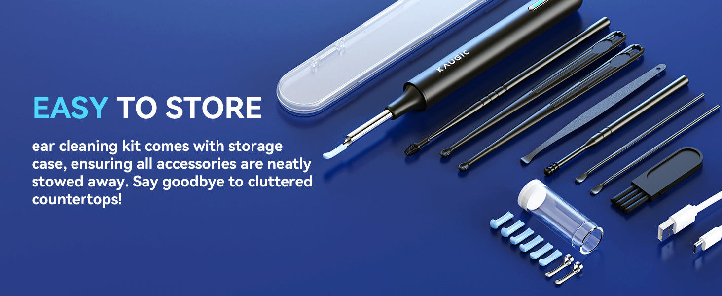 - Multiple Accessories Camera Ear Cleaner: Earwax removal kit with camera contains 15 accessories: Metal Ear Spoon*2 Silicone Earplug Cover*6 Traditional Ear Scoop Kit*7. Earwax Removal Kit Meet your ear cleaning needs. Ear wax remover also contains: Earplug Cover Storage Bottle*1, Charging Cable*1, Instruction Manual*1, Etorage Case*1