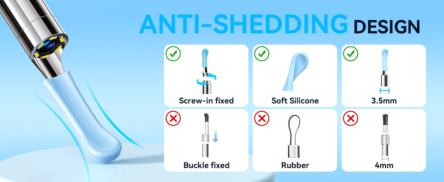 - Safe & Soft Ear Picks: Ear cleaner with camera comes with 2 metal ear spoons with threads and 3 curved ear spoon covers,metal ear picker can be screwed tightly to prevent falling off, and the 3 curved ear spoon covers can be put on metal ear spoons to deal with different kinds of earwax. Ear spoon covers are made of soft silicone and will not harm your ears. Ear cleaners for adults comes with protective cover, which covers ear spoons and prevents it from being contaminated by bugs and dust. Note: Please make sure ear scoop holder is tightly attached to the metal earpick before use