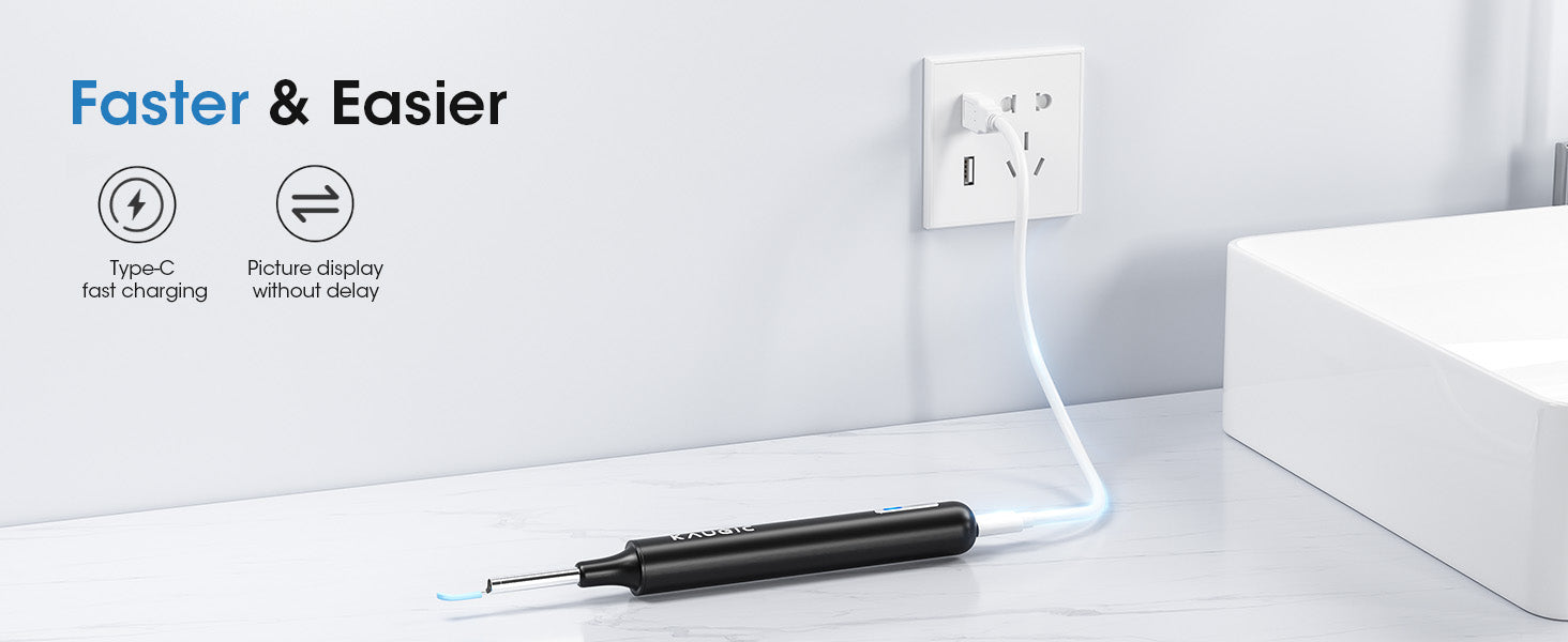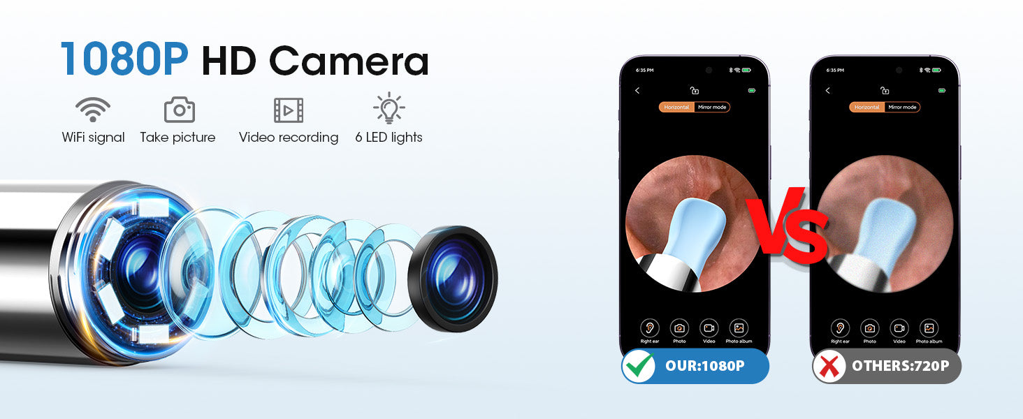Equipped with a 360° wide-angle lens, 6 LED lights, and a 1080P HD camera, this ear cleaner allows you to safely and clearly view your ear canal in real time. The camera tool includes soft silicone and threaded metal ear picks for versatile, safe wax removal. IP67 waterproof design and a 90-minute battery life ensure convenient, long-lasting use. Compatible with Android and iOS.